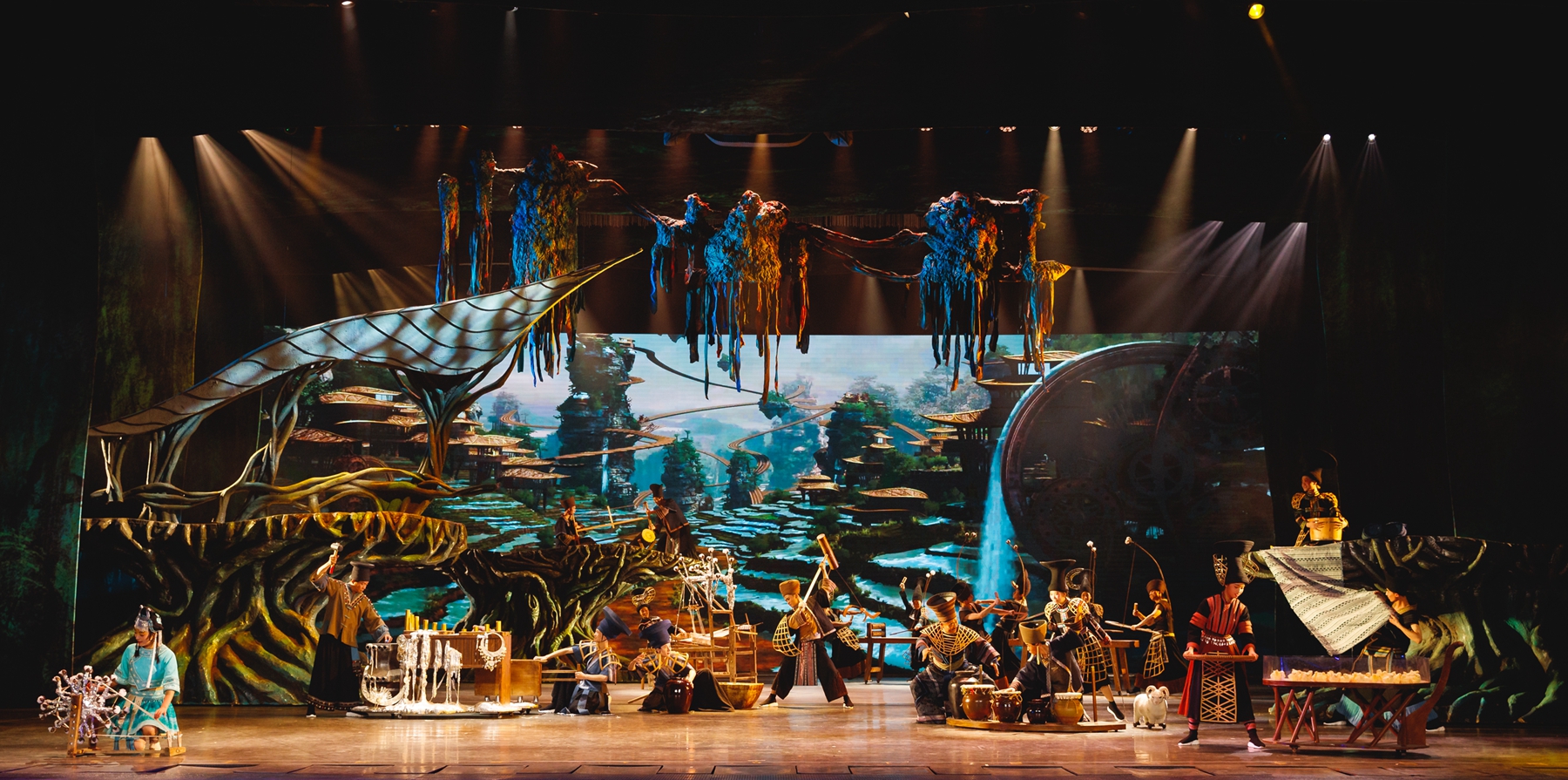 清晨,張家界大山中的古老山寨在雞鳴犬吠聲中蘇醒,山民們在晨曦里忙碌起各自的營生。于是缸、罐、盆、碗變成了樂器,彈棉花、篩米、紡紗、鋸木合奏成了優(yōu)美的旋律,苗族水腔、土家族打溜子等非物質(zhì)文化遺產(chǎn)依次呈現(xiàn)……